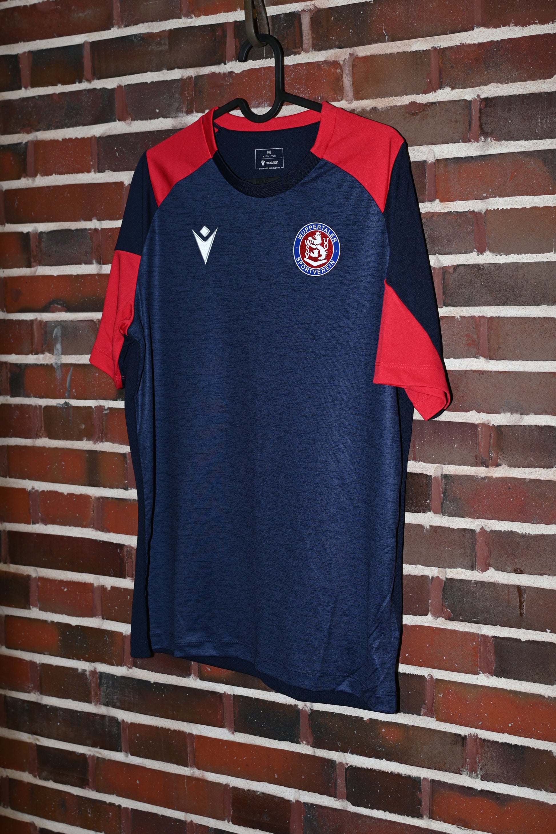 Das dunkelblaue Design wird durch dynamische rote Akzente an Schulter und Ärmeln stilvoll ergänzt. Der klassische Rundkragen sorgt für eine sportliche Passform.
